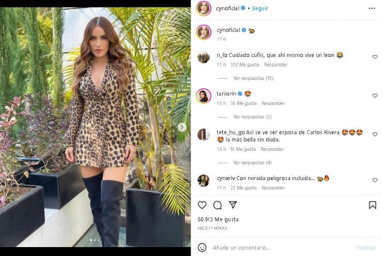Su aclamada combinación se trató de un entallado vestido de leopardo  que, en cierta medida,  resaltó su envidiable cuerpo que tanto la ha caracterizado. Una combinación que enalteció su gran belleza mientras posa en un set fotográfico, tras abandonar los foros del Ajusco el pasado mes de mayo para contraer matrimonio con su actual pareja, Carlos Rivera.