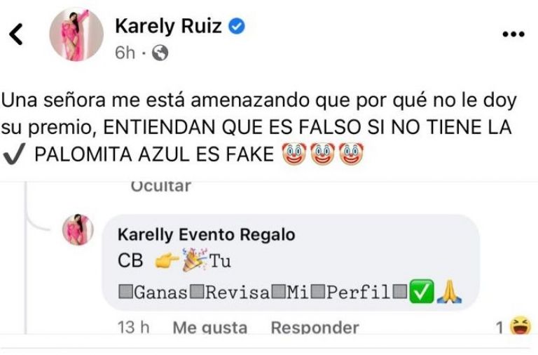 También, adjuntó una captura en la que se ve la cuenta 'Karelly Evento Regalo' en la que se ve como estafa a los internautas con la promesa de un obsequio: "Ganas premios, revisa mi perfil", dice en el perfil falso.