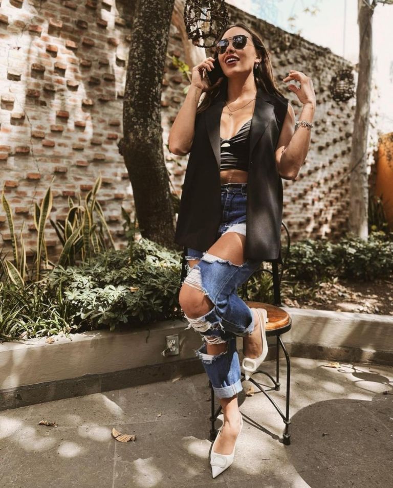 La segunda propuesta de la atleta es mucho más chic, pues demostró que los jeans rotos no solo se usan para atuendos urbanos o desenfadados, pues los elevó al portarlos con una blusa corta ajustada y un chaleco estilo blazer, así como unos stilettos blancos.