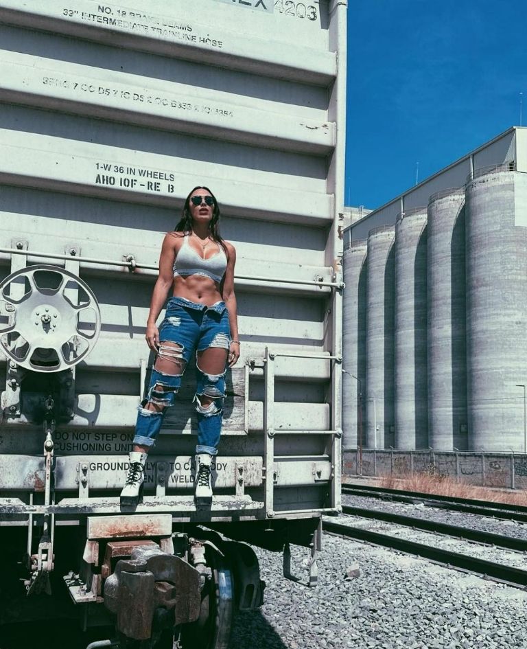 En la primera opción, 'La Amazona' se fue por algo muy básico ya que solo lo combinó con un top deportivo gris y unas botas estilo combate blancas, pero para darle más onda dobladillo los jeans y decidió llevarlos desabrochados dando un toque de sensualidad y rebeldía.