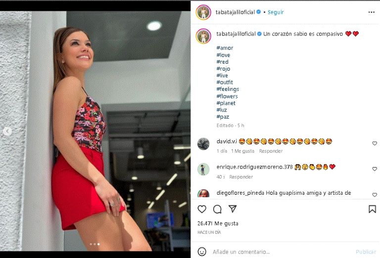 Ciudad de México.- Si algo caracteriza a la gran estrella de televisión, Tabata Jalil, es su gran sentido de la modal, mismo que demostró desde los foros de TV Azteca al aparecer de los más sonriente y con un coqueto look de día. Un don que no dudó en compartir en su cuenta oficial de Instagram para deleitar a sus fieles seguidores y que sigue siendo tendencia en toda la red.