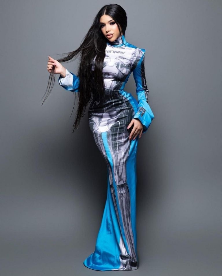 En esta ocasión, la veracruzana se enfundó en un maxi vestido de manga larga que cubre hasta sus pies, pero al ser de una tela de licra se ciñe perfectamente a sus curvas y eso fue lo que llamó la atención, además de su make up dramático.