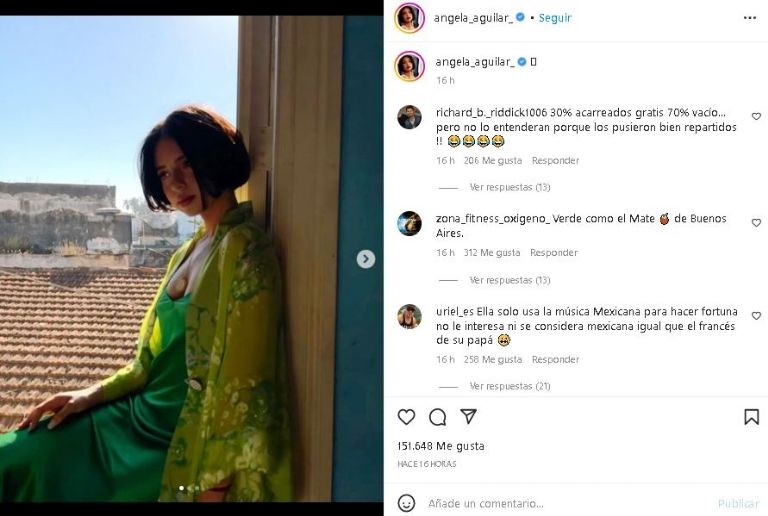 La aclamada estrella del género regional mexicano demostró su gran sentido de la moda, luego de posar con un encantador vestido verde en InstagramCiudad de México.- De nueva cuenta la artista juvenil Ángela Aguilar logró cautivar las rede sociales, luego de modelar con un distinguido outfit de día. Una combinación que causó toda una sensación por toda la Internet, pues lució de lo más maravillosa en Internet. Una publicación que dejó en shock a todos sus fanáticos por lo bien que lució durante esta temporada de invierno desde su hogar.