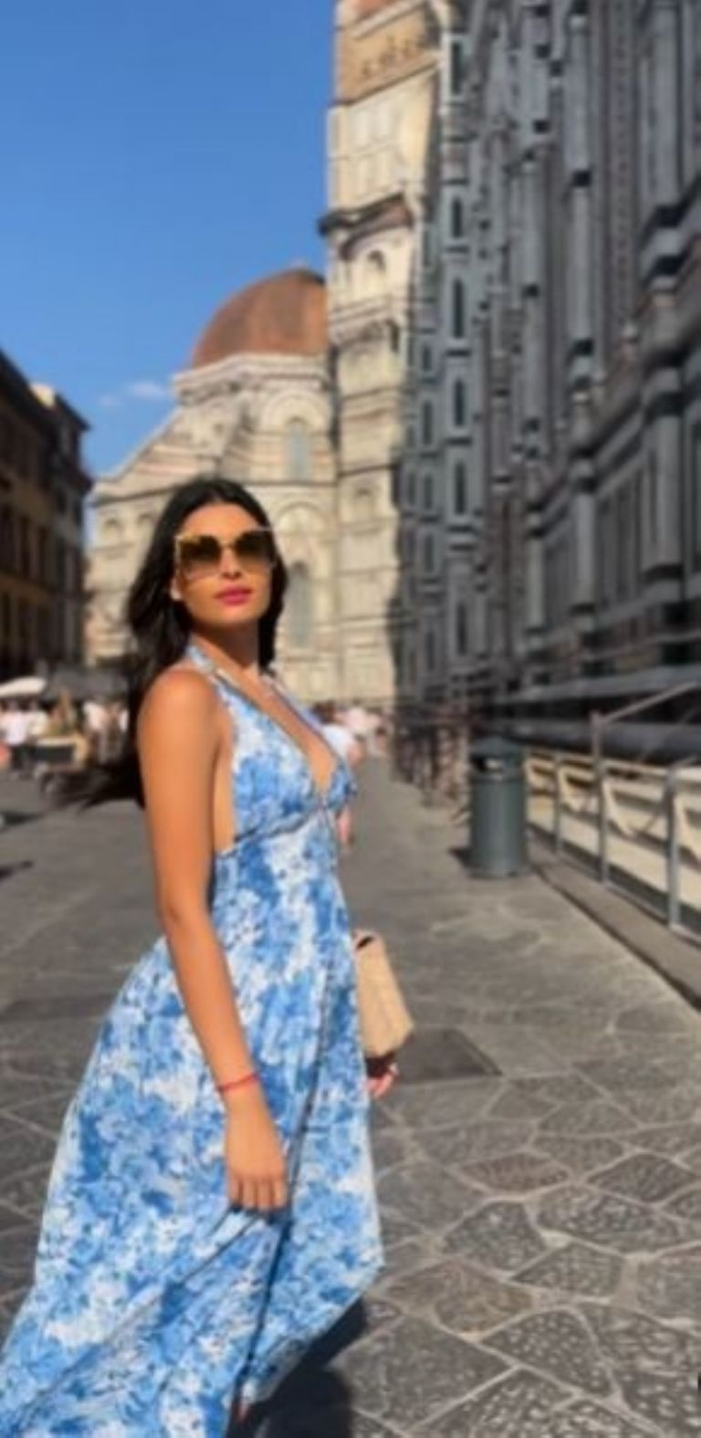 En la imagen aparece con un entallado vestido de color azul con rayas blancas que resaltó su envidiable cuerpo; na combinación que enalteció su gran belleza mientras posa lejos de los estudios de Venga la Alegría, donde demostró su destacada belleza frente en la farándula-