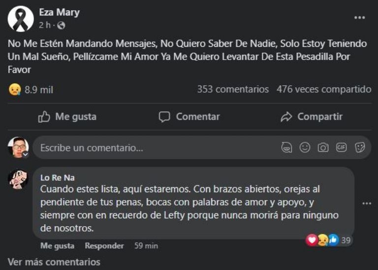 Entre las muchas reacciones que surgieron después de la noticia, una de las más conmovedoras fue la de la esposa de Lefty MS, María Isabel, conocida como Eza Mary. A través de su perfil de Facebook, compartió un triste mensaje expresando su dolor y la sensación de estar atrapada en una pesadilla. Cambió su foto de perfil a un moño negro en señal de luto y pidió a quienes la conocen que no le enviaran mensajes, ya que, por el momento, no quiere saber de nada ni de nadie. En su mensaje, expresó el deseo de despertar de este terrible sueño y pidió a su amado esposo que la pellizcara para salir de esta pesadilla.