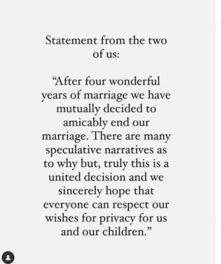 Después de cuatro maravillosos años de matrimonio, hemos decidido mutuamente poner fin a nuestro matrimonio de manera amistosa. Hay muchas narrativas especulativas sobre por qué, pero realmente esta es una decisión unida y esperamos sinceramente que todos puedan respetar nuestros deseos de privacidad para nosotros y nuestros niños", se lee en el post.
