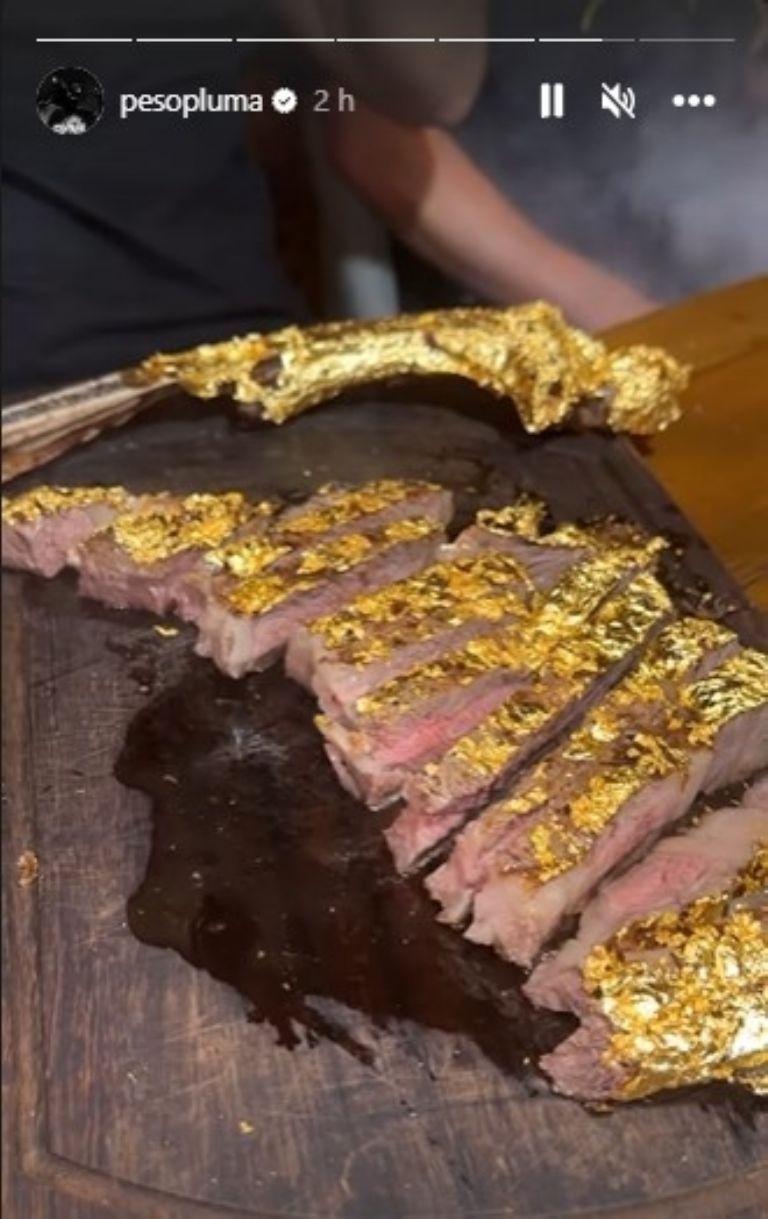 La revelación de esta experiencia culinaria se realizó a través de una publicación en su cuenta oficial de Instagram. En el video compartido, se puede apreciar a Peso Pluma a punto de degustar un suculento corte de carne. Sin embargo, lo que hizo que este plato fuera verdaderamente excepcional es la deslumbrante costra de oro que cubre la parte superior del jugoso filete.