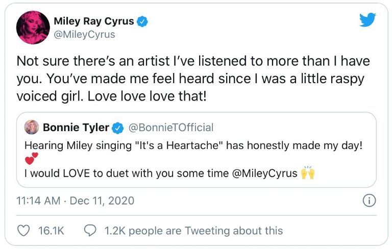 Escuchar a Miley cantar ‘It’s A Heartache’, honestamente, ¡hizo mi día! Me ENCANTARÍA alguna vez hacer un dueto contigo Miley Cyrus