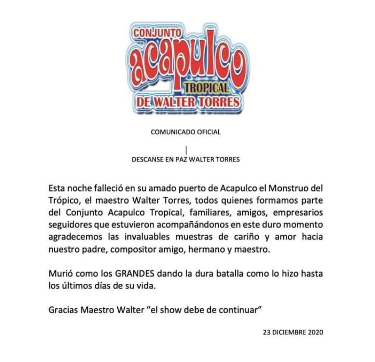 La segunda semana de diciembre, varios medios locales de Guerrero informaron que Walter Torres tenía complicaciones de salud, por lo que los familiares emitieron un comunicado donde aseguraron que el músico estaba estable.
