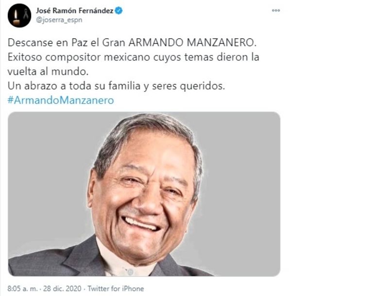 ¡Esto no es una broma de inocentes! Muere el compositor Armando Manzanero a causa del Covid-19 a los 86 años de edadCiudad de México. – Se dio la lamentable noticia de que esta madrugada falleció Armando Manzanero, uno de los compositores mexicanos más importantes, a los 86 años. Sin duda es un día triste para la música mexicana, pues después de haber sido internado en el hospital tras dar positivo a Covid-19, fue este 28 de diciembre que se confirmó la muerte del yucateco.
