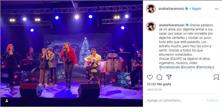 La cantante grupera Ana Bárbara sorprende al ofrecer un concierto virtual junto a todos sus hijos , los cuales demuestran mucho talentoCiudad de México. – La cantante Ana Bárbara ofreció recientemente un concierto virtual a todos sus fans y seguidores la noche del pasado domingo 6 de diciembre, sin embargo, casi al momento de finalizar el show, invitó a pasar a todos sus hijos a que cantaran con ella, y por eso protagonizó un emotivo momento.