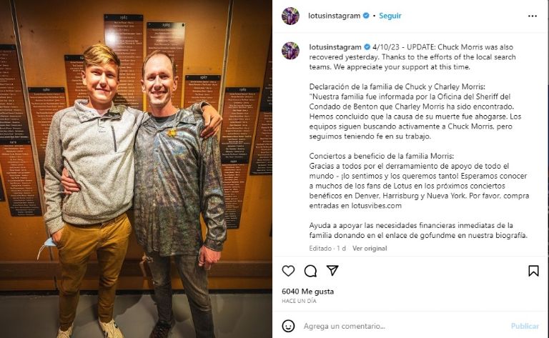 Lotus compartió una declaración de la familia Morris en Instagram agradeciendo a los equipos de búsqueda locales por sus esfuerzos, y señalando que se llevarán a cabo conciertos benéficos en Denver, Harrisburg, Pensilvania y Nueva York. "Gracias a todos por la gran cantidad de apoyo de todo el mundo, lo sentimos y los amamos igualmente", dijo la familia. "Esperamos conocer a muchos de los fanáticos de Lotus en los próximos conciertos benéficos".