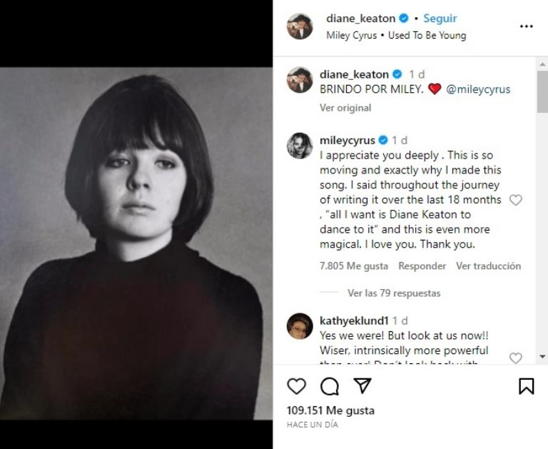 Este no es el primer gesto de apoyo y admiración que Diane Keaton ha mostrado hacia Miley Cyrus y su música. Anteriormente, la ganadora del Premio de la Academia compartió su amor por la exitosa canción de Cyrus Flowers en la misma plataforma, compartiendo un video de sí misma bailando al ritmo de la canción. En ese momento, Keaton escribió: