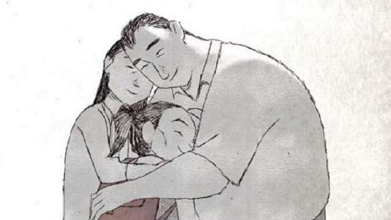 Las sombras de los padres se quieren separar, no obstante, la sombra de la hija los vuelva a unir. Mientras los padres se abrazan, la sombra de la niña se convierte en una luz brillante entre las sombras de sus afligidos padres.
