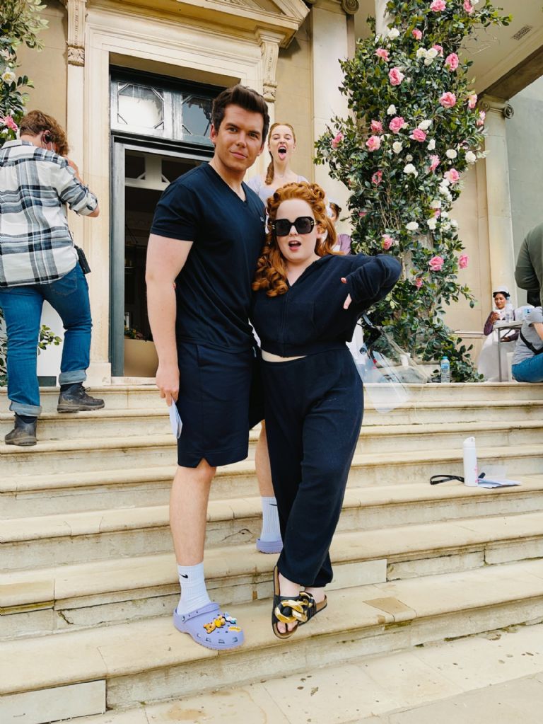 La nueva imagen presenta a las estrellas Nicola Coughlan (Penélope) y Luke Newton (Colin) en el set, vestidos con ropa informal. Detrás de ellos, vestida con el vestuario de la serie, pero haciendo una cara muy diferente a su personaje, está Phoebe Dynevor, que interpreta a Daphne Hastings, la mayor de las hermanas menores de Colin.
