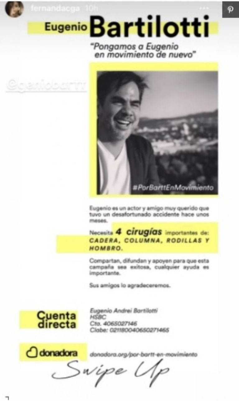 Yo voy a hacer todo lo que pueda por nuestro amigo, pero esta invitación es, si has visto el trabajo de Eugenio en cine, teatro o tele y te ha sacado una risa o tal vez te ha hecho llorar o simplemente eres de las personas que saben que todo en el universo vuelve si lo das con amor aunque sea a un desconocido, a que te sumes a esta ayuda para que Eugenio Bartilotti pueda tener salud de nuevo, dijo la actriz.