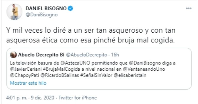 De estas declaraciones, Daniel Bisogno no se arrepiente de haberlas dicho al aire, e incluso las compartió en su Twitter después de que un usuario señalara lo que sucedió en el programa de TV Azteca. De inmediato se llenó de algunos comentarios criticando a Daniel, pues decían que era pura envidia, y otros pocos defendían al conductor.